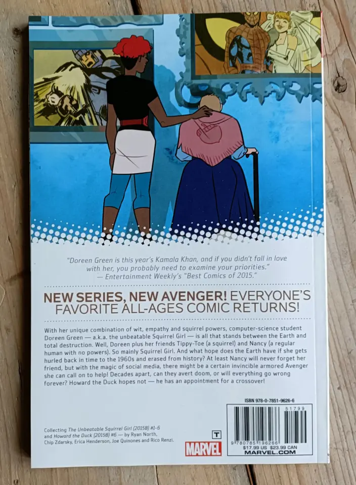 New series, New Avenger! With her unique combination of wit, empathy and squirrel powers, computer science student Doreen Green - aka the unbeatable Squirrel Girl - is all that stands between the Earth and total destruction. Well, Doreen plus her friends Tippy-Toe (a squirrel) and Nancy (a regular human with no powers). So, mainly Squirrel Girl. Then what hope does the Earth have if she gets hurled back in time to the 1960s and erased from history? At least Nancy will never forget her friend, but what invincible armored Avenger can she call on to help, through the magic of social media? Decades apart, can they avert doom, or will everything go wrong forever? Howard the Duck hopes not...he has an appointment for a crossover!