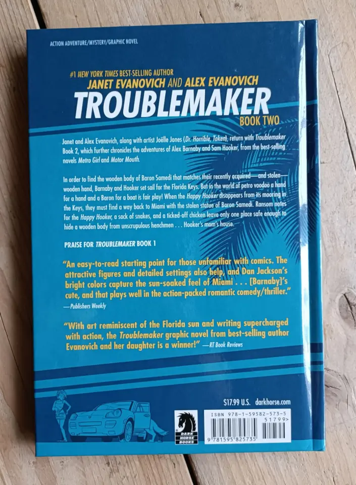 There's no smooth sailing for Alex Barnaby and Sam Hooker in the second volume of best-selling author Janet Evanovich's graphic-novel adventure, Troublemaker. Barnaby, Hooker, Rosa, Felicia, and Beans the St. Bernard set sail to the Florida Keys in order to find the wooden body of Baron Samedi that matches their recently acquired (and stolen) wooden hand. But in the world of Petro Voodoo a hand for a hand and a Baron for a boat is fair play. When the Happy Hooker disappears from its mooring in the Keys, Barnaby and Hooker have to find a way back to Miami with the stolen body of Baron Samedi. Ransom... notes for the Happy Hooker, a sack of snakes, and a ticked-off chicken leave only one place safe enough to hide a body . . . Hooker's mom's house-a situation that makes the sack of snakes look like chump change. o Janet Evanovich adds a new chapter to her New York Times best-selling Barnaby series in graphic-novel format!