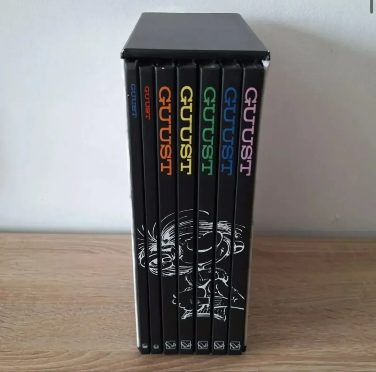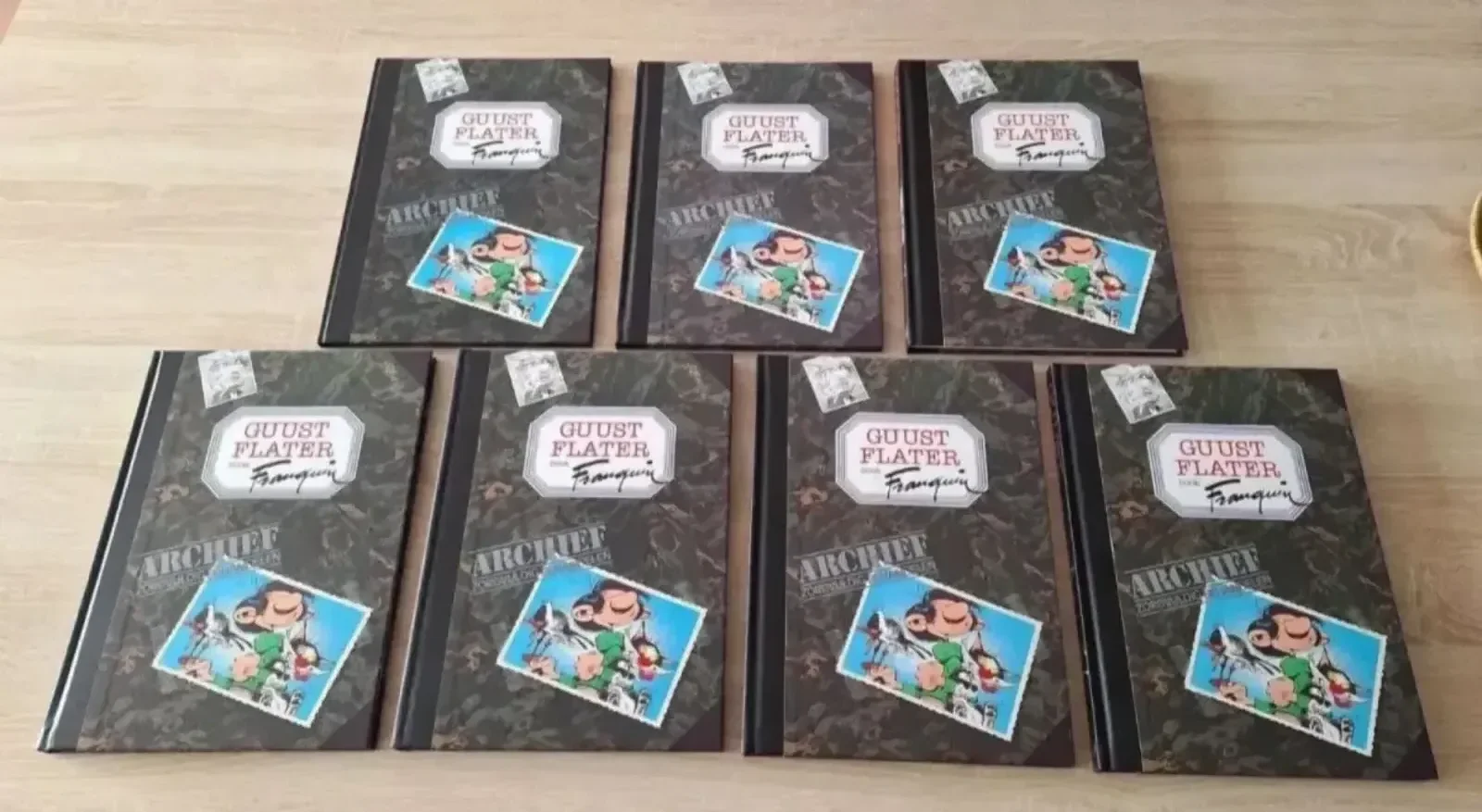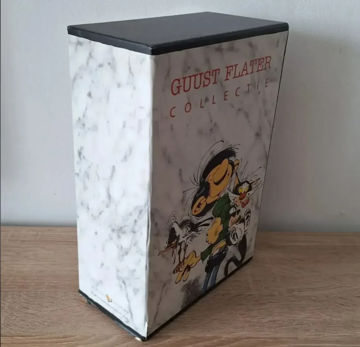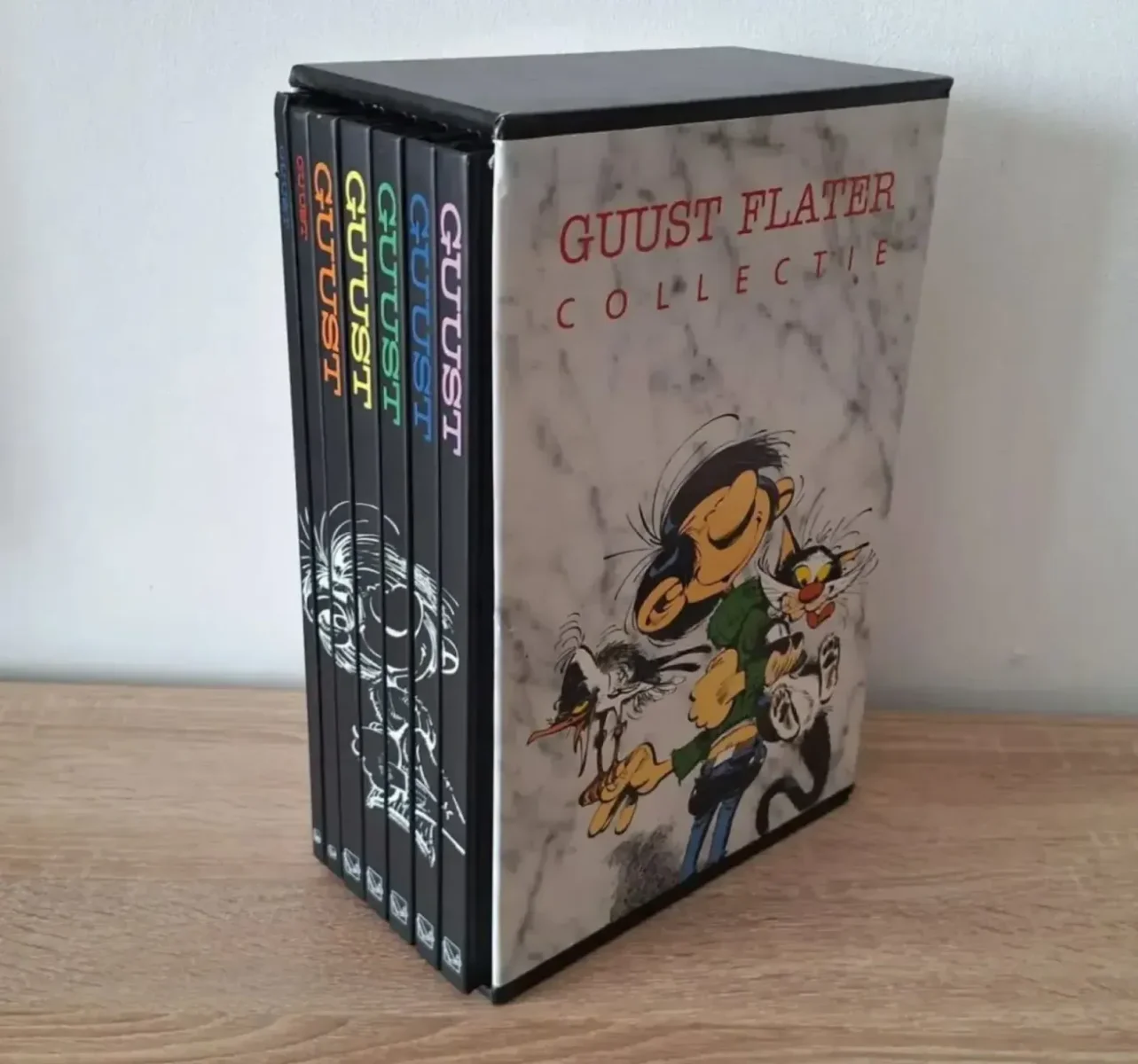 Deze Guust Flater Collectie bevat een set van zeven stripboeken in een cassettebox.